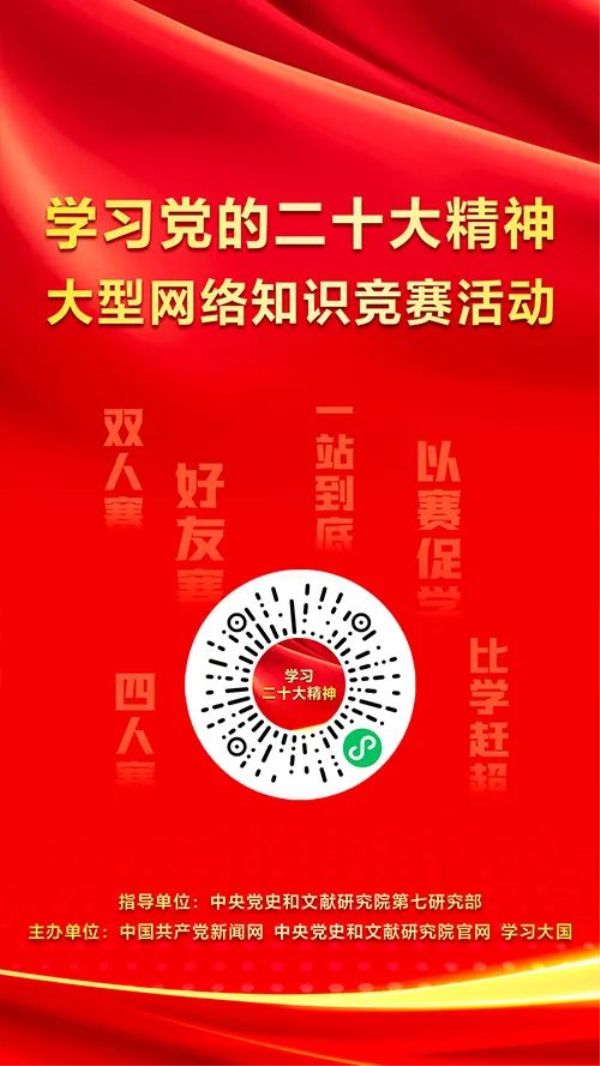 為學(xué)習(xí)宣傳貫徹黨的二十大精神,引導(dǎo)廣大干部群眾深入學(xué)習(xí)黨的二十大報告和黨章,認(rèn)真領(lǐng)悟黨的二十大提出的新思想新論斷、作出的新部署新要求,推動黨的二十大精神廣泛深入為廣大干部群眾所了解和掌握,“學(xué)習(xí)黨的二十大精神”大型網(wǎng)絡(luò)知識競賽活動正式啟動。