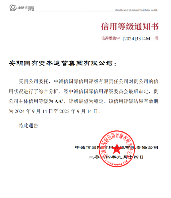 近日,經(jīng)國內權威評級機構中誠信國際信用評級有限責任公司(下稱“中誠信國際”)的評定,安陽國有資本運營集團有限公司(下稱“安陽國資集團”)再次獲AA+主體信用等級,評級展望為“穩(wěn)定”。 這是繼2023年4月東方金誠國際信用評估有限公司評定安陽國資集團AA+主體信用等級后,國內又一家具有較高市場認可度的評級公司給出的AA+主體信用等級,實現(xiàn)了國資集團“雙AA+評級”,進一步增強了國資集團信用等級的公信力。