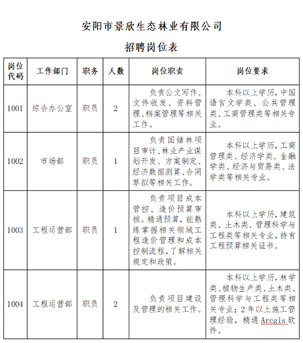 安陽市景欣生態(tài)林業(yè)有限公司(以下簡稱“景欣林業(yè)”)是安陽市國家儲備林建設PPP項目公司,根據(jù)工作發(fā)展需要,擬委托安陽鼎泰勞務派遣有限責任公司(以下簡稱“鼎泰公司”)面向社會公開招聘6名工作人員。現(xiàn)將有關事項公告如下: