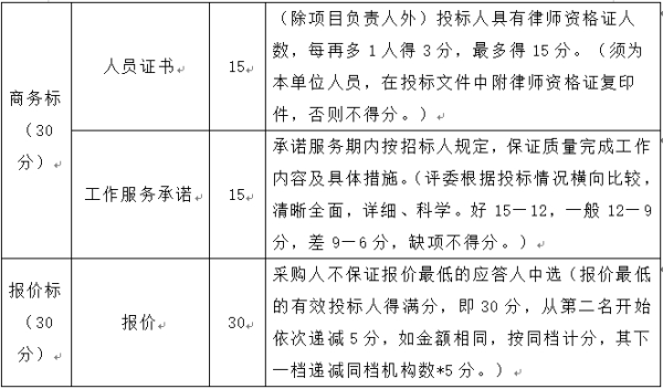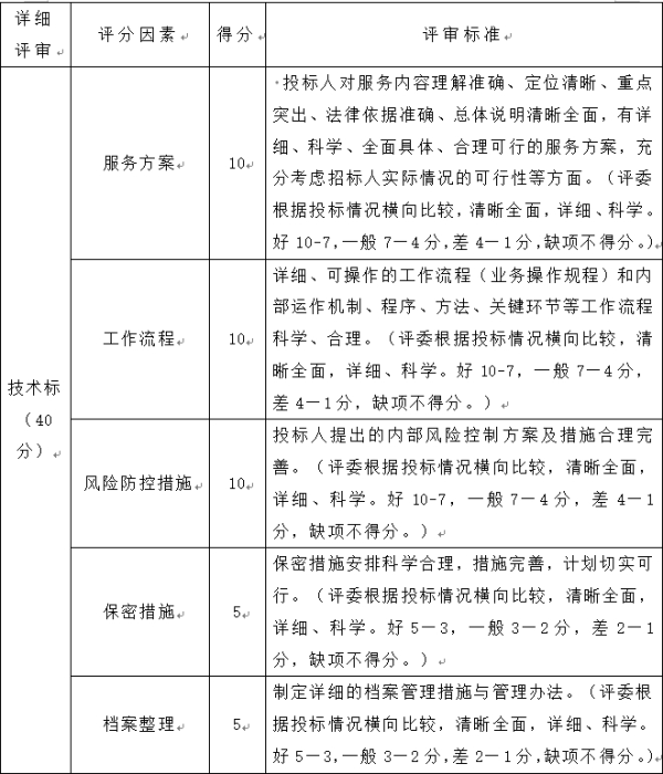 本次采購(gòu)擬采用綜合評(píng)分法。綜合評(píng)價(jià)指標(biāo)體系,包括技術(shù)指標(biāo)(40%)、商務(wù)指標(biāo)(30%)、報(bào)價(jià)(30%)。排名前2的應(yīng)答人入圍,具體評(píng)分標(biāo)準(zhǔn)如下: