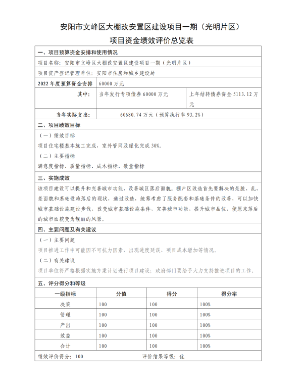 安陽(yáng)市文峰區(qū)大棚改安置區(qū)建設(shè)項(xiàng)目一期(光明片區(qū))項(xiàng)目資金績(jī)效評(píng)價(jià)報(bào)告