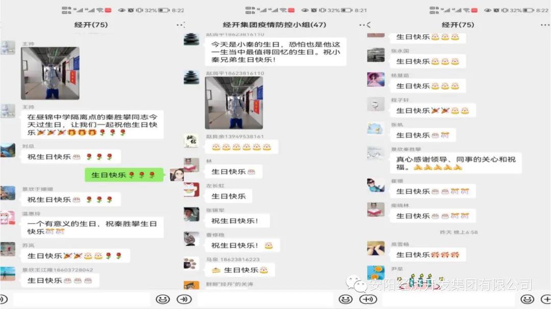 1月25日,是經(jīng)開集團(tuán)志愿者秦勝攀34歲的生日。在晝錦中學(xué)隔離點(diǎn),他向往常一樣重復(fù)著為隔離人員配送生活物資、清理垃圾、環(huán)境消殺等工作。下班后在宿舍出現(xiàn)了暖心的一幕:在這個(gè)特殊的時(shí)期、特殊的地方、特殊的環(huán)境,沒有蠟燭、沒有蛋糕,但有特殊的“家人”陪他一起過生日?!凹胰恕眰兗娂姳硎緪坌?,送上了溫暖的祝福。