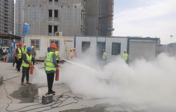 施工單位安全負責人首先向應急小組全體成員講解了消防安全常識、火災預防措施,介紹了滅火器材的試用、保養(yǎng)方法,要求各班組安全責任人嚴格按照有關(guān)規(guī)定,落實消防安全責任,做好各類防火巡查、檢查工作,定期檢測、清洗、更換各類消防器材和設(shè)施,確保關(guān)鍵時刻拉得出、沖得上,同時手把手教導如何使用滅火器等相關(guān)常識。隨后,應急小組成員進行了實物操作模擬演練。